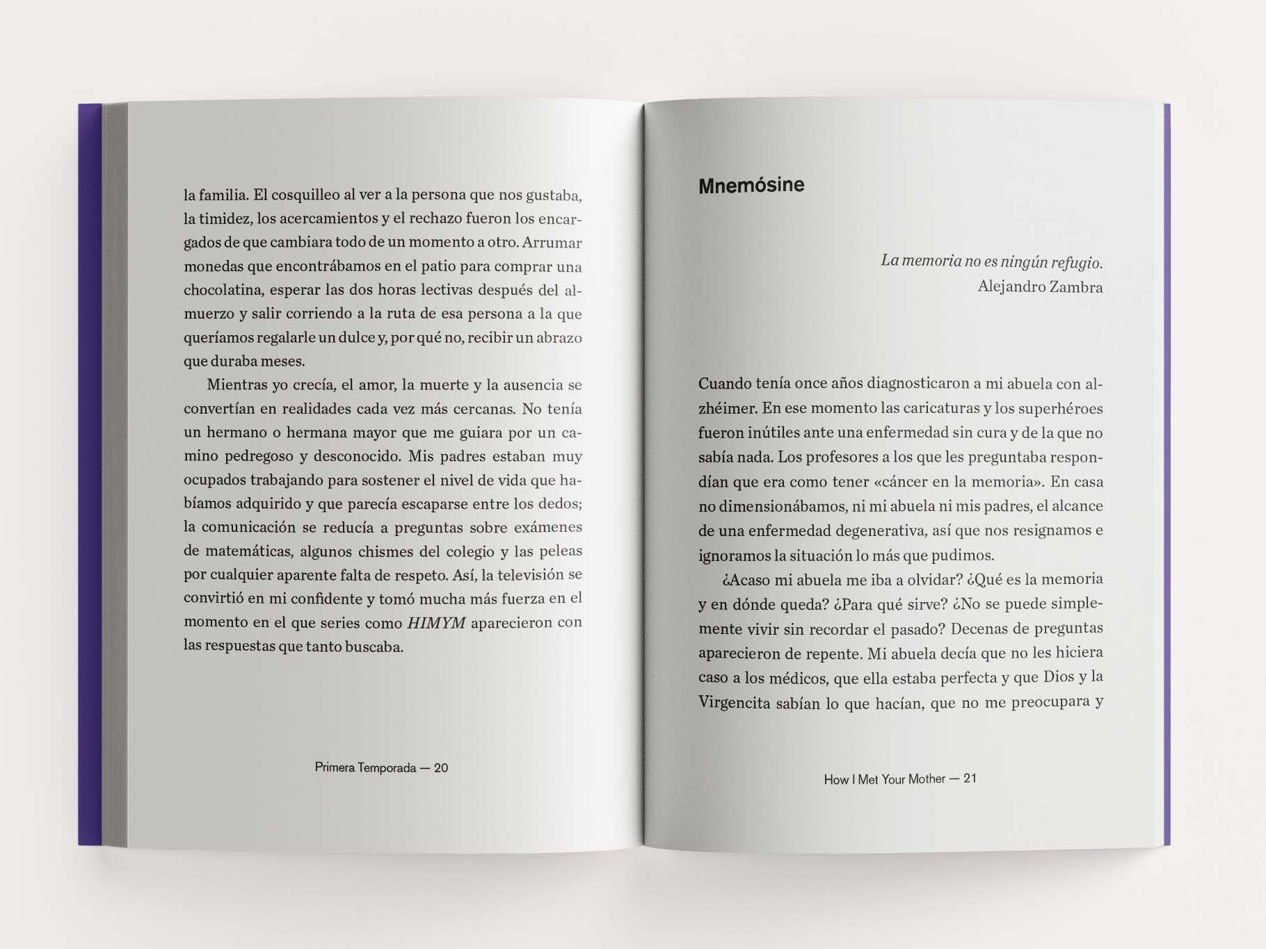 Esta obra hace parte de la colección Primera Temporada. Nicolás Rocha reflexiona sobre el amor y la memoria a través de una de sus series más amadas: How I Met Your Mother. El paraguas amarillo y el ‘lebenslangerschicksalsschatz’ llevan al autor a preguntarse por sus propias emociones, como un personaje más de la producción audiovisual.